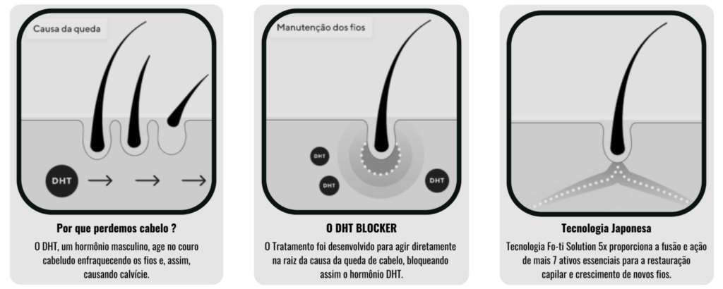 O DHT BLOCKER é uma formulação importada Japonesa que contém tudo o que você precisa para restaurar a sua saúde capilar e voltar a crescer cabelos em regiões falhas da cabeça. Ele age bloqueando o hormônio responsável por causar a queda de fios e o adoecimento do couro cabeludo.